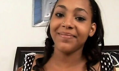 A petite cutie tries to drink a huge black cock, after which she jumps hard on it.