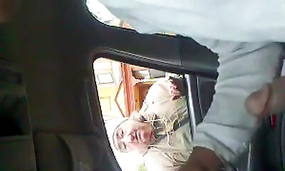 Busty teen flash bosoms and grab cock in car to stranger