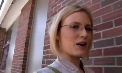 Nerdy brunette in glasses Michele James is testing fat black dick catapulting out of the wall